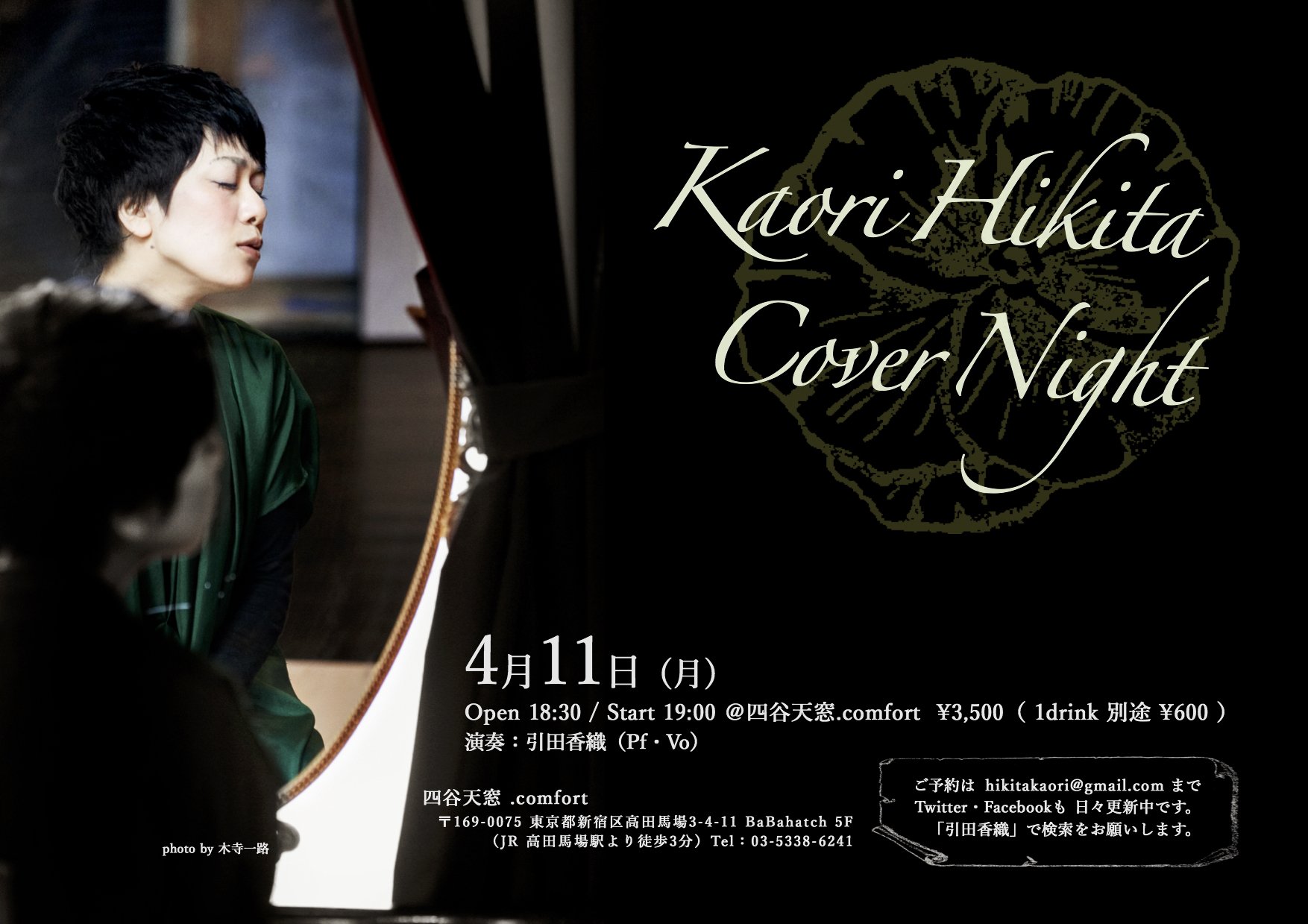 Kaori Hikita Cover Night 引田香織(Pf・Vo) ※スペシャルゲストも登場する…かも? 18:30 op19:00 st ¥3,500(1ドリンク別途¥600) ご予約・お問い合わせは hikitakaori@gmail.com まで 12 Tue |
